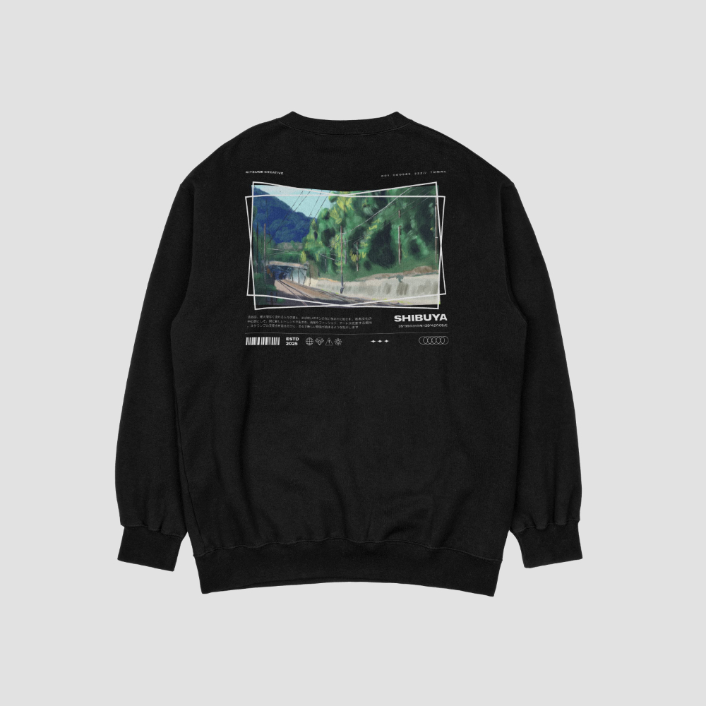 Na frente, o minimalismo encontra a identidade da marca: o logo Kitsune Creative Outfits Made For All aparece com leveza, dando o tom da peça. Já nas costas, a estampa traz um cartão postal nostálgico da antiga Shibuya, com uma linha de trem atravessando a cidade, montanhas ao fundo e o céu azul típico dos dias calmos de Tóquio.