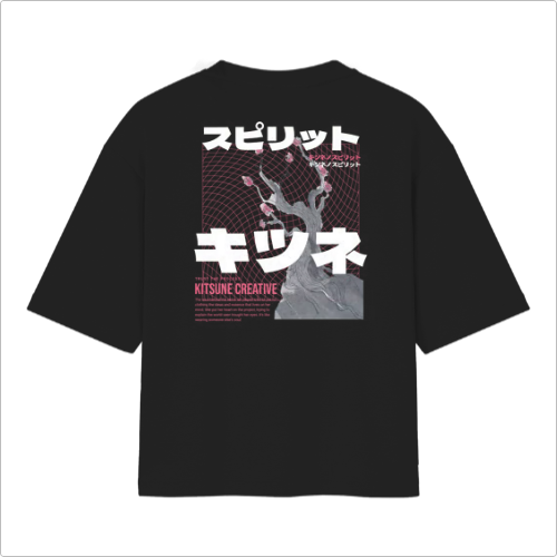 Sakura que resiste, floresce onde ninguém espera. Força antiga, beleza viva, pra vestir e sentir. Num visual oversized pra você sentir o peso de vestir uma Kitsune.